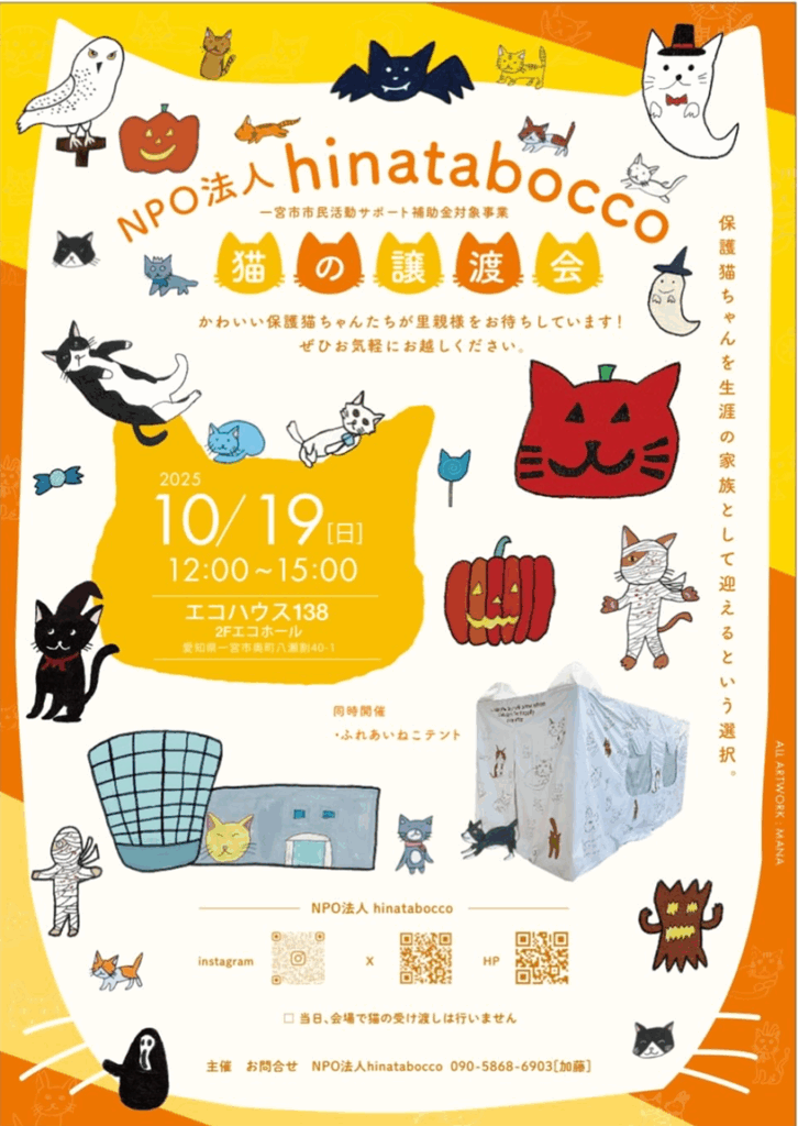 10月19日(日)譲渡会を開催します 2025年10月7日 最終更新日時 : 2025年10月7日 hinatabocco 10月19日(日) 12時~15時 エコハウス138 2Fエコホール 愛知県一宮市奥町八瀬割40-1 FacebookXBlueskyCopy