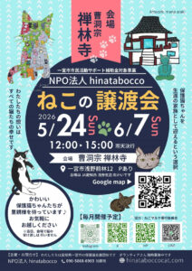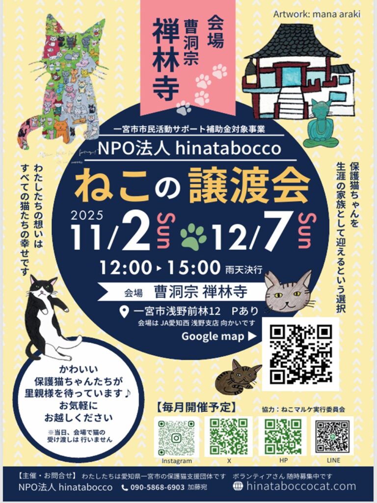 11月2日(日)・12月7日(日)譲渡会を開催します 2025年10月29日 最終更新日時 : 2025年10月29日 hinatabocco 11月2日(日)12時~15時 12月7日(日)12時~15時 ※開始時間が変更になりました。 曹洞宗 禅林寺 愛知県一宮市浅野前林12 FacebookXBlueskyCopy