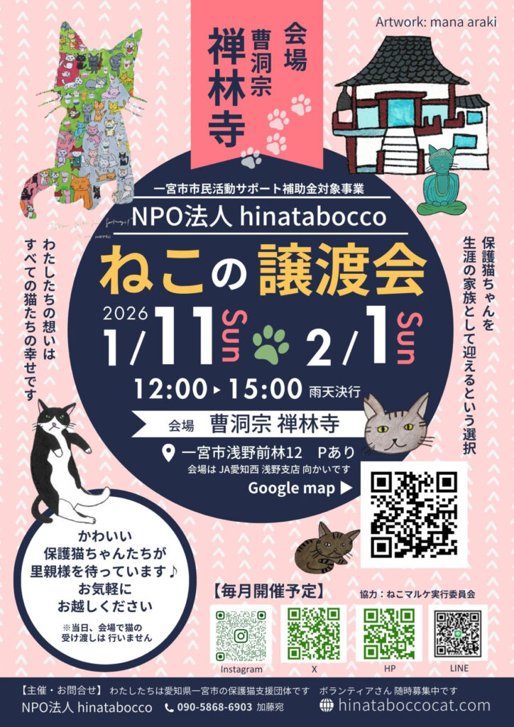 2026年1月11日・2月1日(日)譲渡会開催 2025年12月29日 最終更新日時 : 2025年12月29日 hinatabocco 2026年1月11日(日)と2月1日(日)12時~15時 曹洞宗 禅林寺(愛知県一宮市浅野前林12)にて譲渡会を開催致します。 FacebookXBlueskyCopy